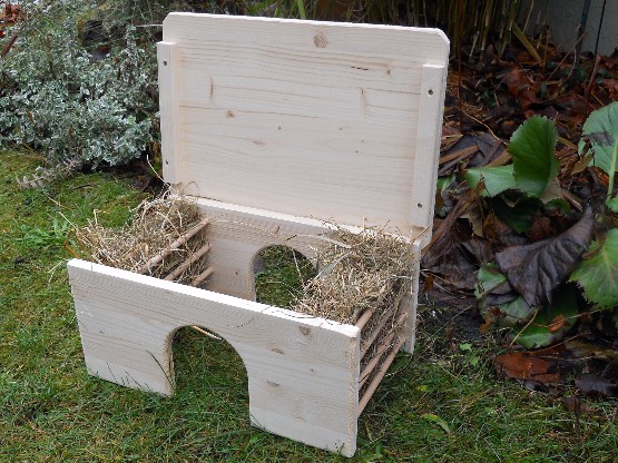 Während die Tiere geschützt im Häuschen sitzen können sie nebenbei ihr Heu naschen.