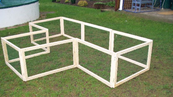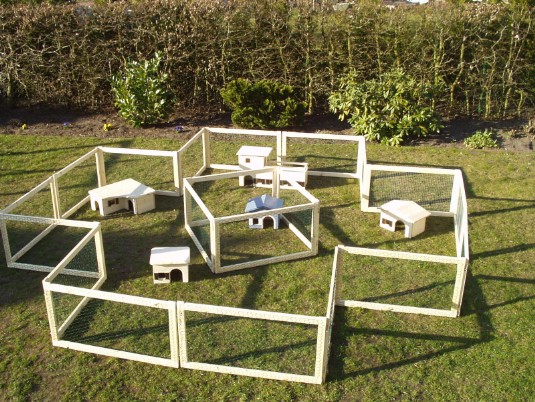 - Durch die Haken-Ösen-Verbindung ist eine sehr flexible Stellweise möglich; selbst eine Unterteilung ist möglich. So können z.B aus sieben Einzelteilen zwei getrennte Gehege von je 1 qm entstehen.