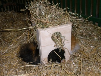 - Das Heu liegt auf mind. 2 Streben, welche auf ca. halber Höhe eingezogen sind. So kann das Heu von innen oder durch ein Fenster nach Außen gezogen werden.