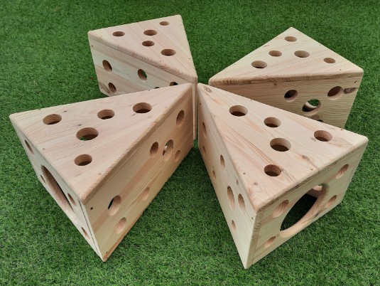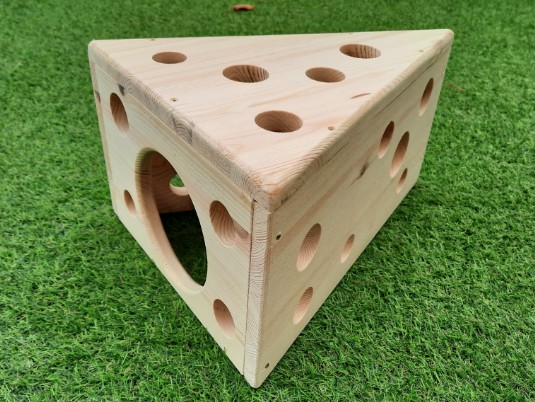 - viele unterschiedliche Bohrungen in den Wänden und im Dach ermöglichen das Einstecken verschiedener Futtersorten