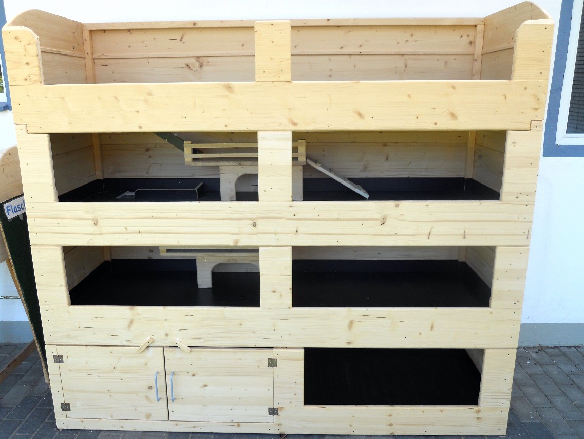 Dadurch könnten einzelne Tiere oder Gruppen im Bedarfsfall in den einzelnen Etagen separiert werden, und es erleichtert u. a. den "Hausputz".
